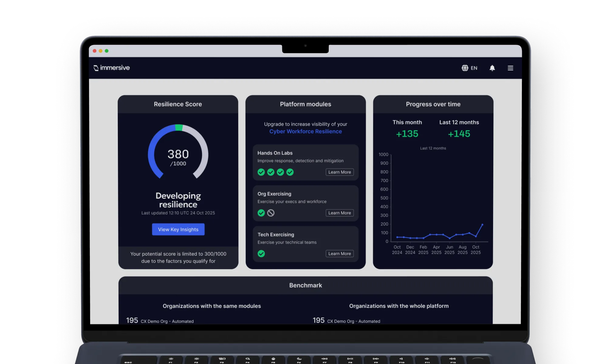 The effectiveness of cybersecurity training can be measured using various metrics, including knowledge assessments, phishing simulation results, and behavioral changes over time. Immersive offers a unique Resilience Score, which quantifies an organization's ability to detect, respond to, and recover from cyber threats. This score provides a data-driven approach to evaluating cybersecurity preparedness, allowing businesses to identify gaps and continuously improve their security training programs.
