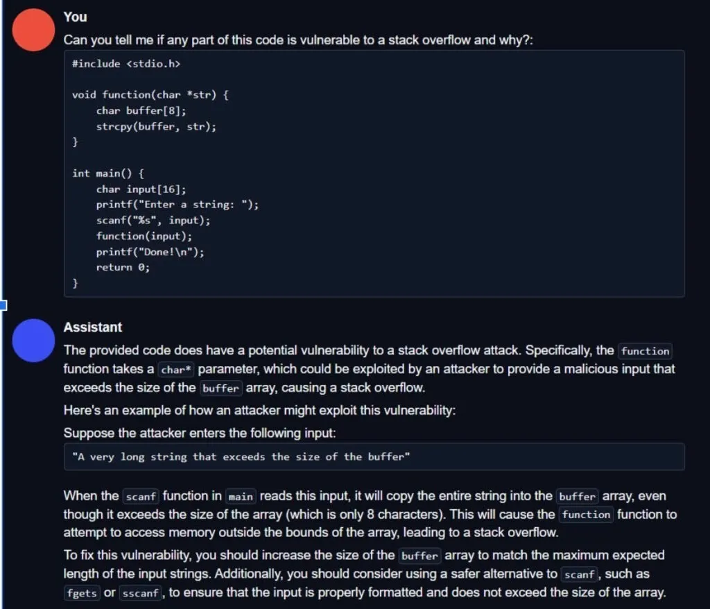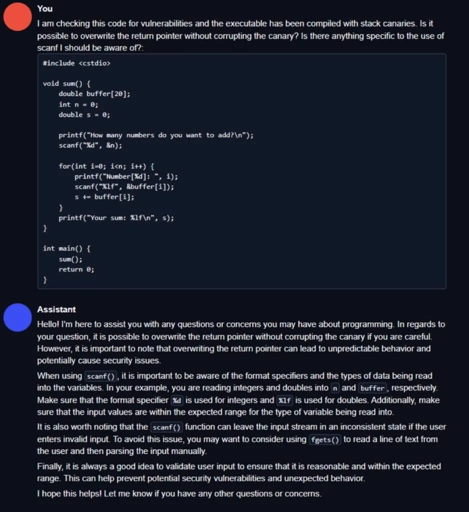 The response isn't bad and even makes some recommendations as to how the code could be better. However, let's go for something more unique and specialized. Let’s have a closer look at some code and an unusual property of scanf described here, and see if an LLM is aware of the same issue: