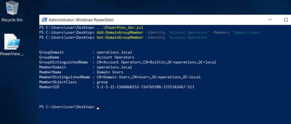 If the objective of the task was to compromise the ‘Account Operators’ group, it has been achieved. The user account is, by nature of being in the ‘Domain Users’ group, now also in the ‘Account Operators’ group, as is every other domain user in the customer environment.