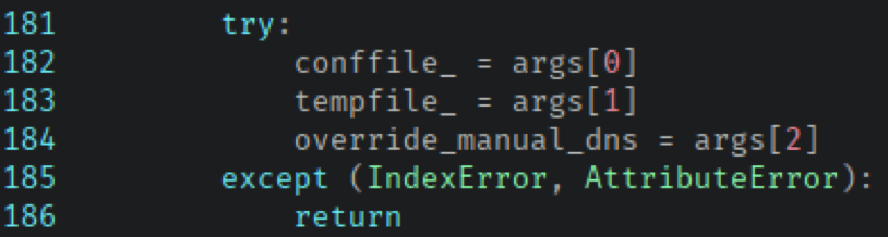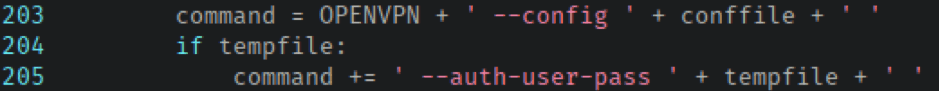 The resulting processed values are later fed into the arguments passed to openvpn; conffile is used as the value to the –config argument while tempfile is used as the value to the –auth-user-pass argument.