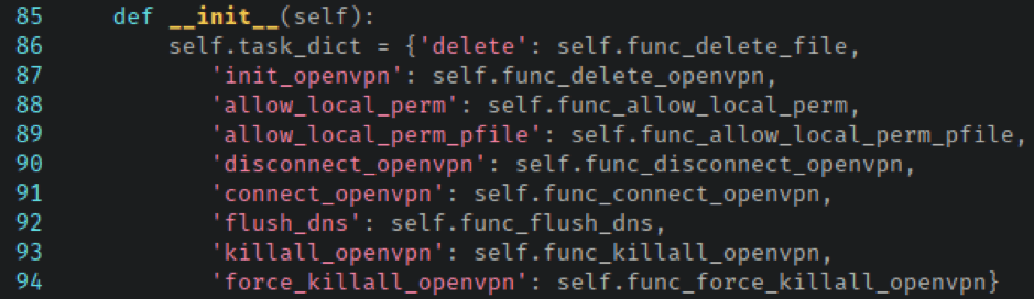 The func_disconnect_openvpn method looked a better bet for code execution, as it built and returned a command to execute depending on the operating system; on Windows it produced a taskkill command, on Linux a pkill command, and on FreeBSD and macOS a kill command. Closer inspection didn’t reveal any means of injecting additional commands or changing the process to be terminated.