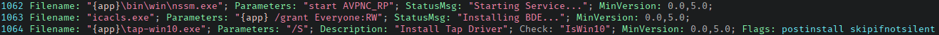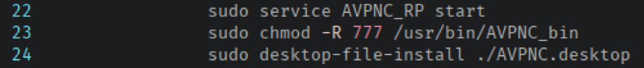 During the installation process on Windows, Linux and FreeBSD, the permission set applied to the client’s installation directory is highly permissive. Examining the installation script extracted from the Linux .deb file and .tar.gz file reveals that world-writable permissions (777) are recursively applied to /usr/bin/AVPNC_bin.