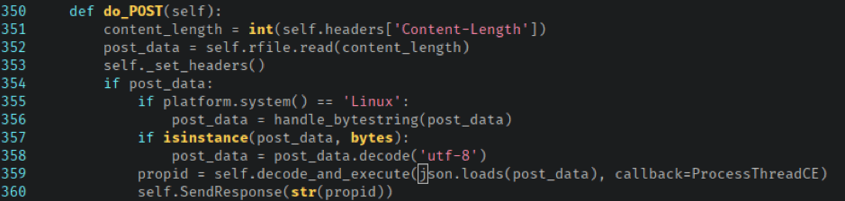 When the AVPNC_RP service starts, it initialises a custom Python SimpleHTTPServer on port 5006 bound to the loopback interface on 127.0.0.1. Examination of the CommandServerRequestHandler class shows that it inherits from the BaseCommandExec class, which sounded particularly interesting, as both of these classes reside in a file called command_exec.py. When this server receives an HTTP POST request, it calls the decode_and_execute method from the BaseCommandExec class and passes it the POST body, which is expected to be a JSON structure.