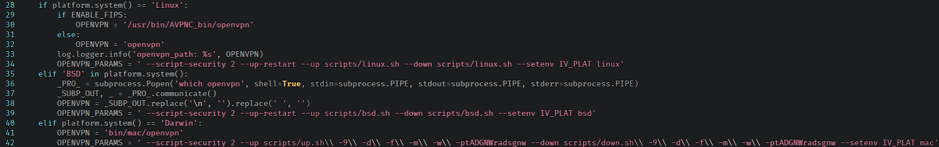 The Linux, macOS and FreeBSD versions of the VPN client use the openvpn command’s –up and –down flags to execute shell scripts when a VPN connection is established and terminated respectively. On Linux the client uses /usr/bin/AVPNC_bin/scripts/linux.sh as the value for both of these arguments; similarly, FreeBSD uses /usr/bin/AVPNC_bin/scripts/bsd.sh for each argument. On macOS the client passes /Applications/Aviatrix VPN Client.app/Contents/Resources/scripts/up.sh to –up and /Applications/Aviatrix VPN Client.app/Contents/Resources/scripts/down.sh to –down.
