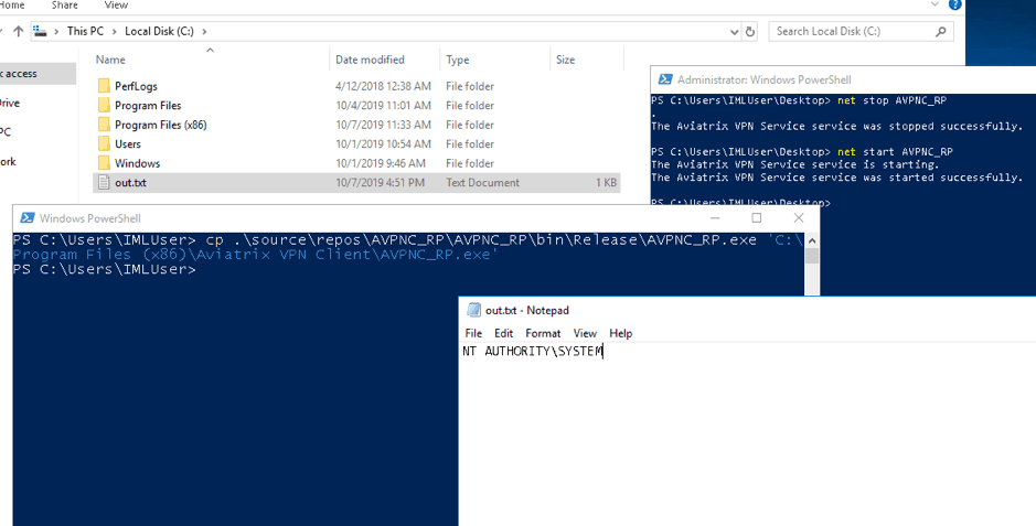 On Windows the client does not use the –up and –down arguments, making exploitation a little harder. Due to the file permissions, it is possible to replace the service executable ((AVPNC_RP.exe)) with a malicious executable that, when executed, would be running as NT AUTHORITY\SYSTEM. Of course, the service has to be stopped before this file can be replaced, which requires either an administrator account or the relevant permissions to restart the service. A simple executable was created using the C# code below to demonstrate this attack avenue.