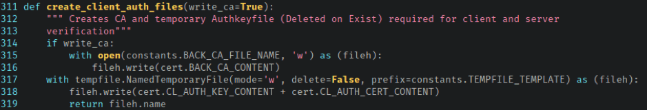 A bit of digging inside the RootProcessExec class in command_exec.py revealed how the client certificates were retrieved. All of the certificates and private keys used by the application are stored in certs.py. Before a request is made to the service, the application writes the relevant key and certificates to a temporary file using create_client_auth_files in file_utils.py.