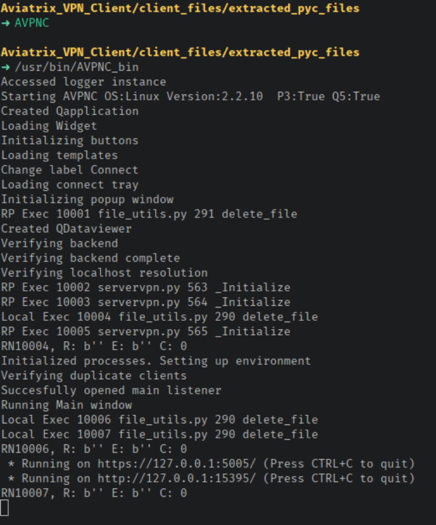 Research into the Aviatrix VPN client began after noting the verbose output when starting the client on a Linux machine.