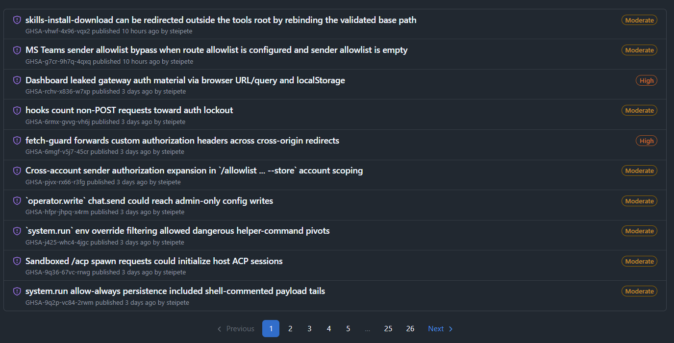 Before we get into the supply chain side, it's important to note that OpenClaw itself has had a large number of vulnerabilities reported in its core platform. Some are informational or lack security best practices, and some are significant and can lead to real impact and compromise. A few of these are highlighted below.