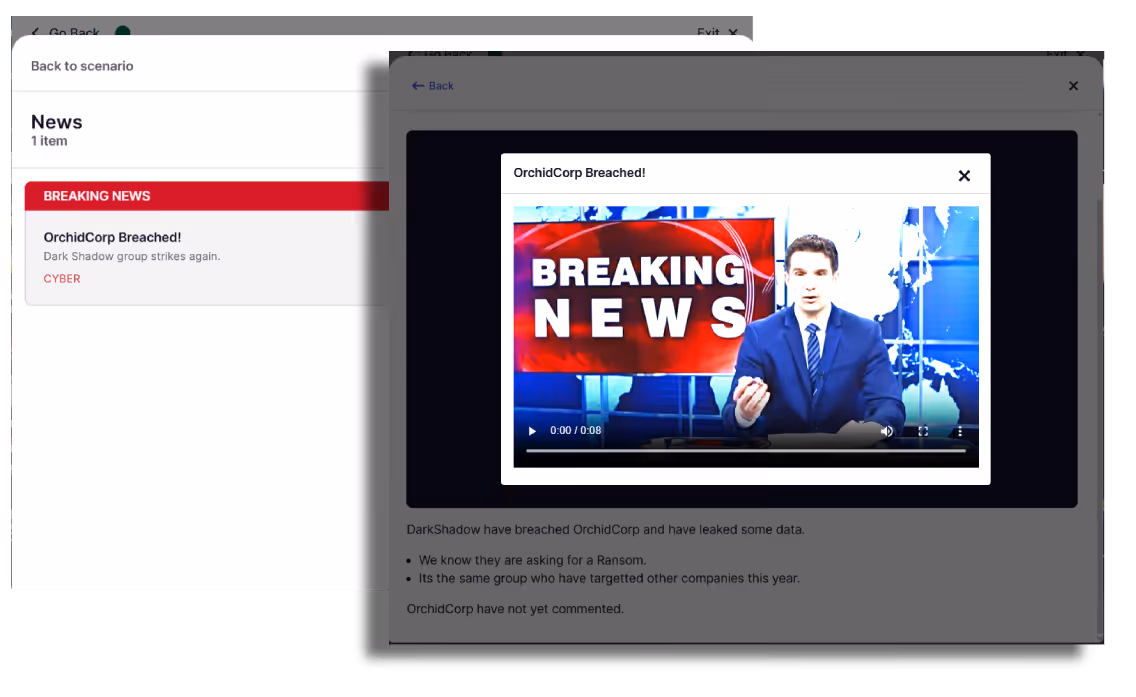 Static simulations often lack the unpredictable human element. That’s why Dynamic AI Feed also introduces the ability for managers to deploy dynamic AI characters, from ransomware actors and journalists reporting on the incident to internal stakeholders, like your CEO. These characters respond in real time to learner inputs, forcing participants to simultaneously manage multi-faceted communications and even negotiate under pressure.